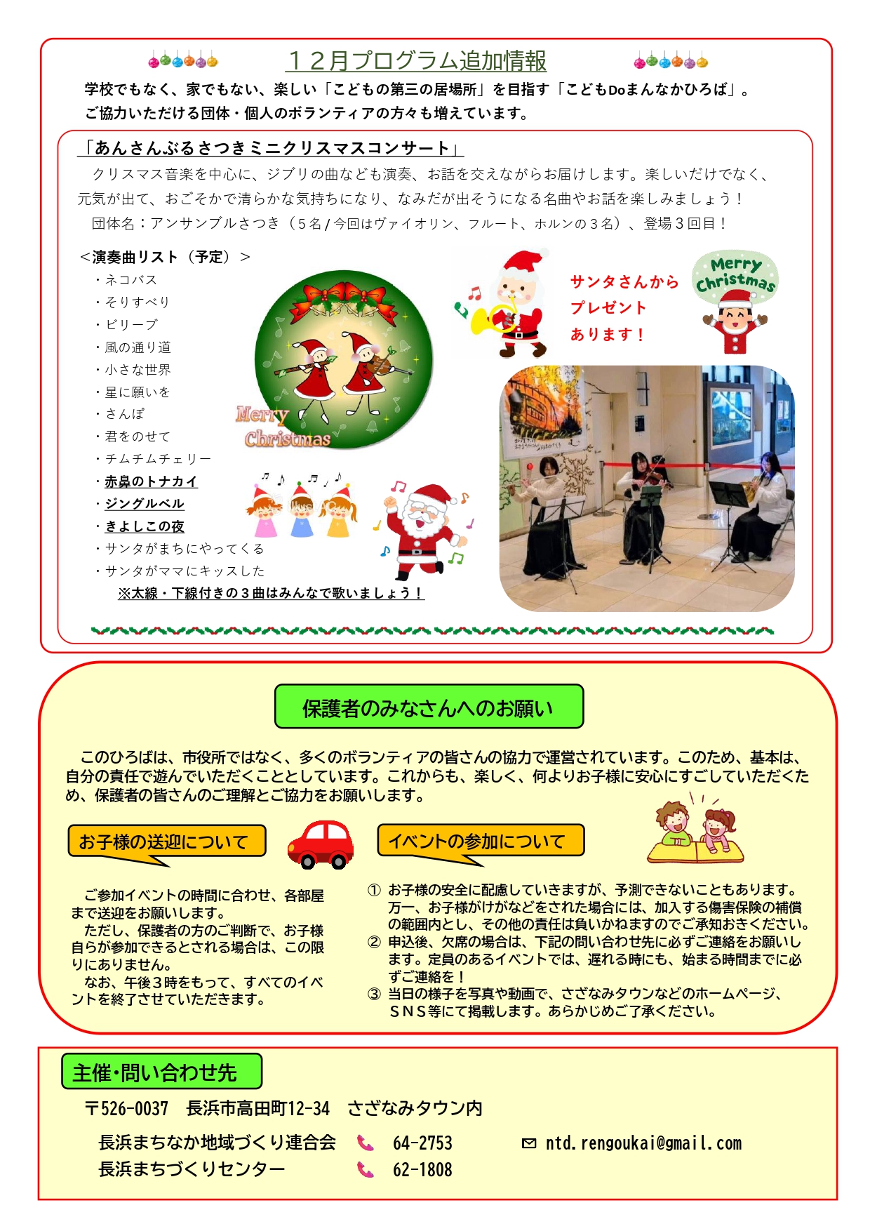 毎月第2土曜日10時からの開催を基本として、中心市街地の多様で複雑な子育て・子育ち環境下での新たなこどもの居場所づくりとして、以下の「ひろば」をさざなみタウン1階の各部屋にてサービスを展開します。