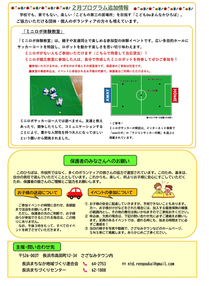 このひろばは、市役所ではなく、多くのボランティアの皆さんの協力で運営されています。このため、基本は、自分の責任で遊んでいただくこととしています。また、これからも、楽しく、何よりもお子様に安心にすごしていただくため、保護者の皆さんのご理解とご協力をお願いします。