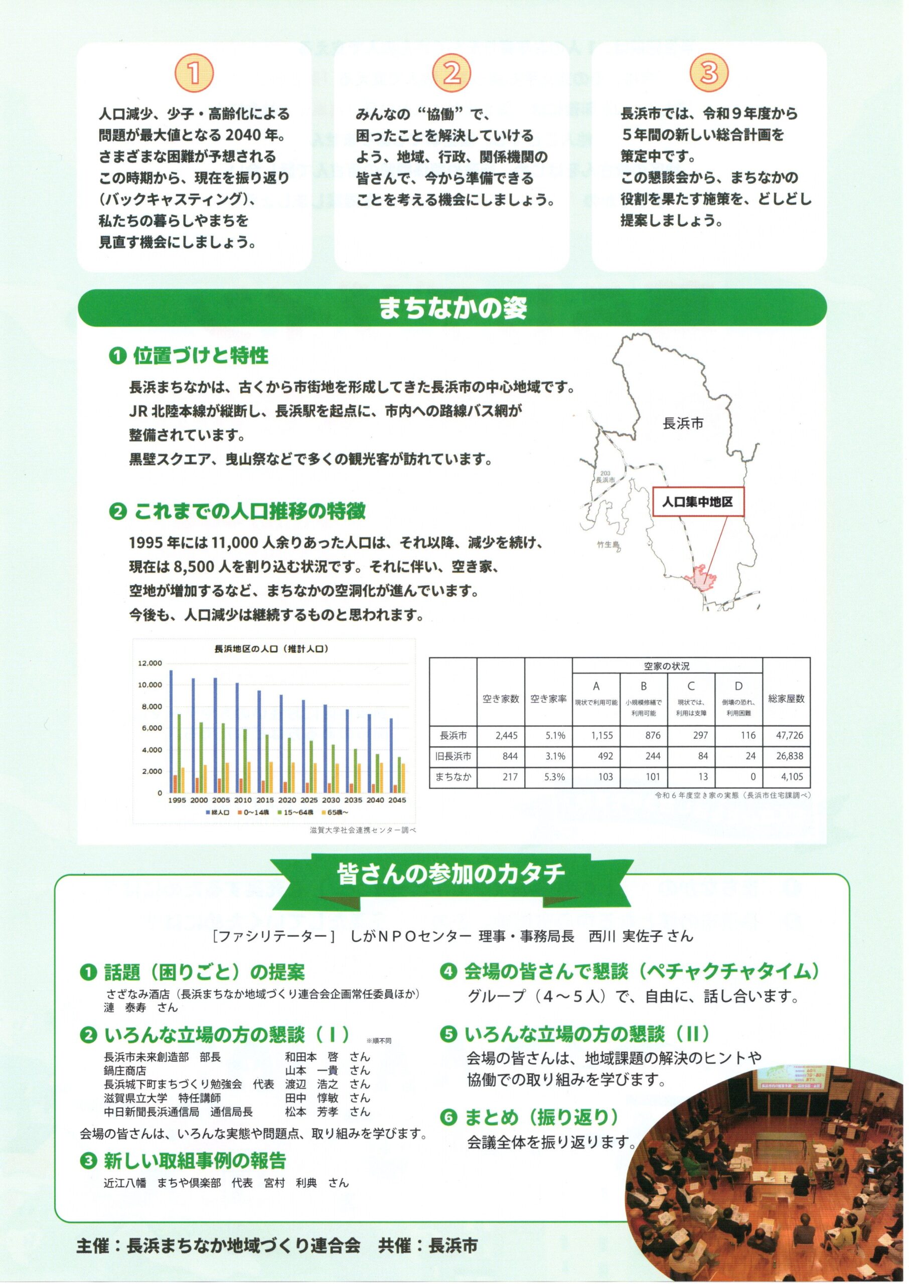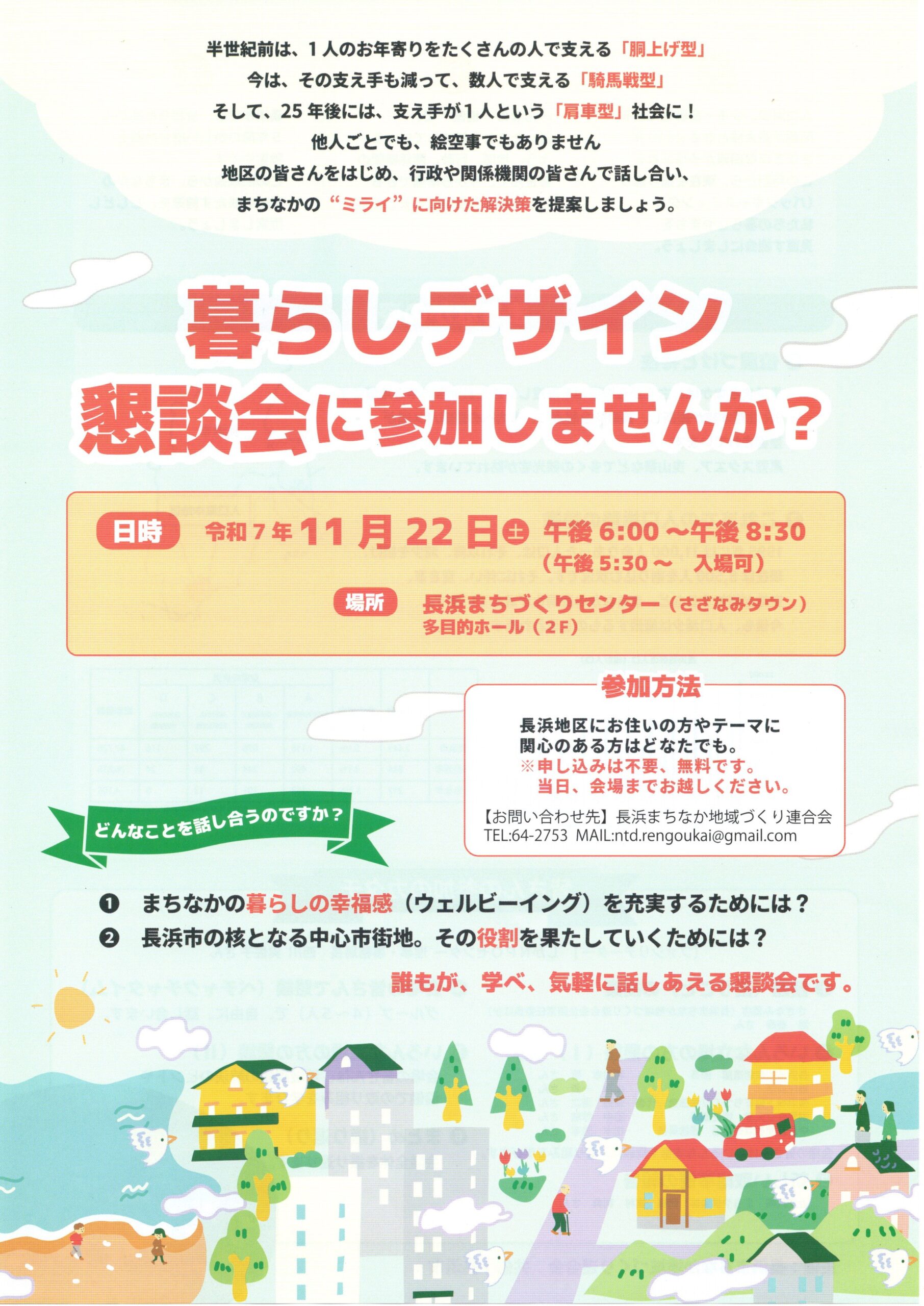 そこで、「暮らしデザイン懇談会」を企画し、地域、行政、関係機関の参加をもとに、長浜市の令和9年度からはじまる5年間の総合計画につなげていきましょう。